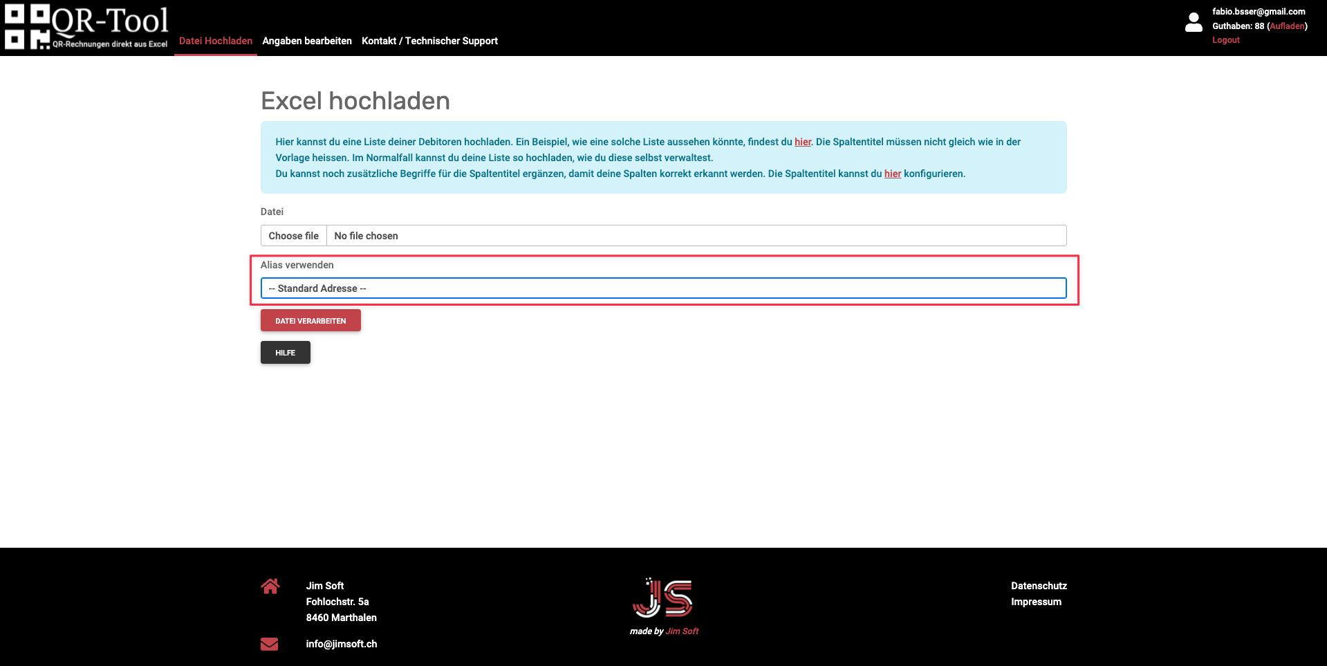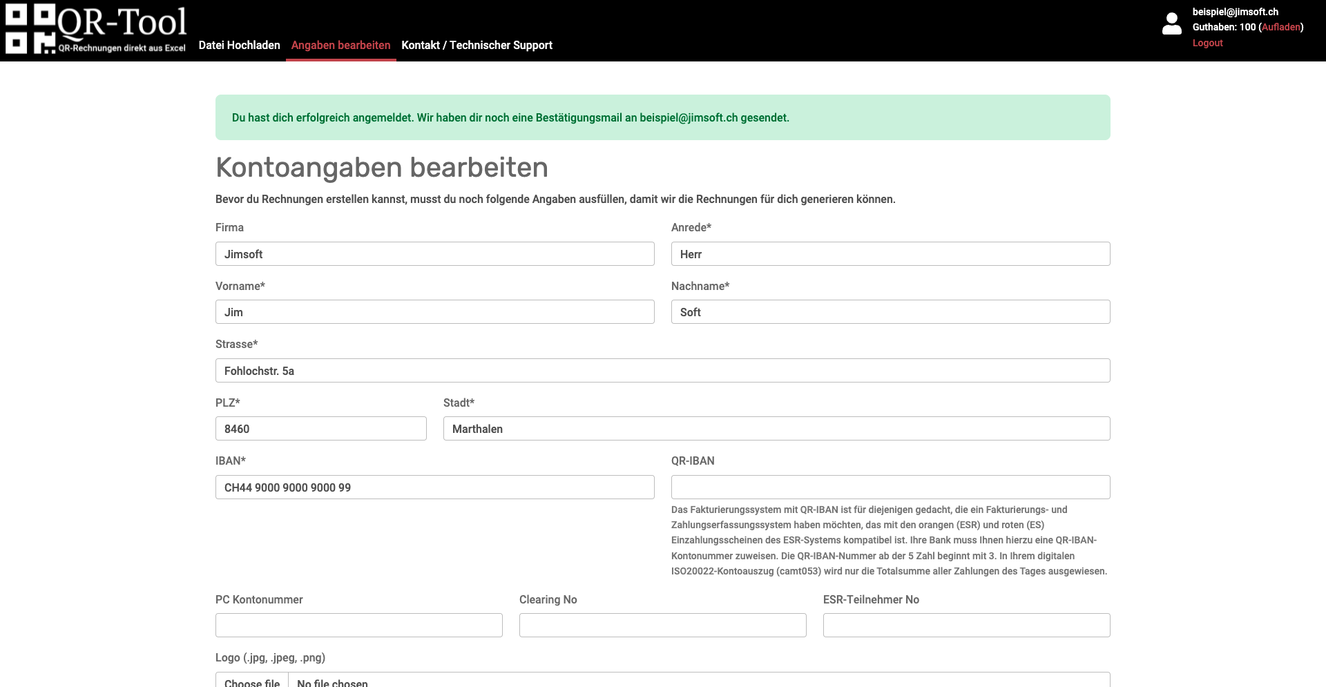 Nach der Anmeldung musst du einmalig deine Kontodaten hinterlegen und kannst einige Einstellungen zu den PDF-Rechnungen ergänzen. Wenn du alle Pflichtfelder ausgefüllt hast, kannst du nach dem Speichern deine erste Liste hochladen